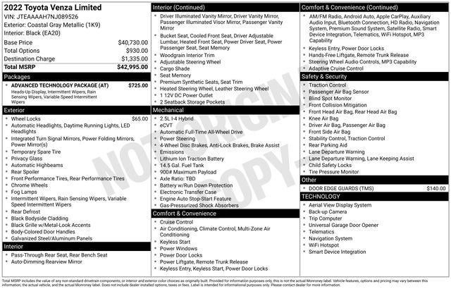 Coastal Gray 2022 Toyota Venza Limited 4D Sport Utility AWD 2.5L 4-Cylinder DOHC 16V Continuously Variable (ECVT)