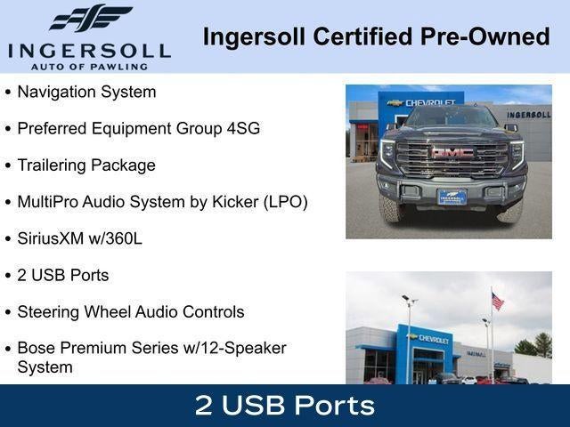120-Volt Bed Mounted Power Outlet, 120-Volt Instrument Panel Power Outlet, 16-Way Power Driver Seat Adjuster w/Lumbar, 16-Way Power Passenger Seat Adjuster w/Lumbar, 2 Charge/Data USB Ports Inside Center Console, 2 Type-C Charge-Only Rear USB Ports, 2 USB Ports, Apple CarPlay/Android Auto, Auto High-beam Headlights, Bed View Camera, Bose Premium Series w/12-Speaker System, Color-Keyed Carpeting Floor Covering, Compass, Deep-Tinted Glass, Driver-Selectable Full-Locking Front Differential, Driver-Selectable Full-Locking Rear Differential, Electric Rear-Window Defogger, Electrical Steering Column Lock, Floor-Mounted Center Console, Front Prem Floor Liners w/Removable Carpet Insert, Front Rainsensing Wipers, Fully automatic headlights, Gloss Black Header w/Drk Nickel Grille Insert Bars, GMC Connected Access Capable, HD Surround Vision, Heated 2nd Row Outboard Seats, Heated Driver & Front Outboard Passenger Seating, Heavy-Duty Air Filter, Hill Descent Control, Hitch Guidance w/Hitch View, In-Vehicle Trailering App, Integrated Trailer Brake Controller, IntelliBeam Automatic High Beam On/Off, Keyless Open & Start, LED Cargo Area Lighting, Memory seat, Multicolor 15 Diagonal Head-Up Display, MultiPro Audio System by Kicker (LPO), Navigation System, OnStar & GMC Connected Services Capable, Perimeter Lighting, Power Door Locks, Power Front Passenger Windows w/Express Up/Down, Power Front Windows w/Driver Express Up/Down, Power Rake & Telescoping Steering Column, Power Rear Windows w/Express Down, Power Sliding Rear Window w/Rear Defogger, Power Sunroof, Preferred Equipment Group 4SG, Push Button Start, Rear Cross Traffic Braking, Rear Pedestrian Detection, Rear Prem Floor Liners w/Removable Carpet Insert, Rear Wheelhouse Liners, Remote Vehicle Starter System, Safety Alert Seat, SiriusXM w/360L, Spray-On Pickup Bed Liner w/AT4X Logo, Steering Wheel Audio Controls, Theft Deterrent System (Unauthorized Entry), Trailer Camera Provisions, Trailer Side Blind Zone Alert, Trailer Tire Pressure Monitor System, Trailering Package, Ultrasonic Front & Rear Park Assist, Universal Home Remote, Ventilated Driver & Front Passenger Seats, Wheels: 18 x 8.5 Gloss Black Painted Aluminum, Wi-Fi Hotspot Capable, Wireless Charging, Wireless Phone Projection.