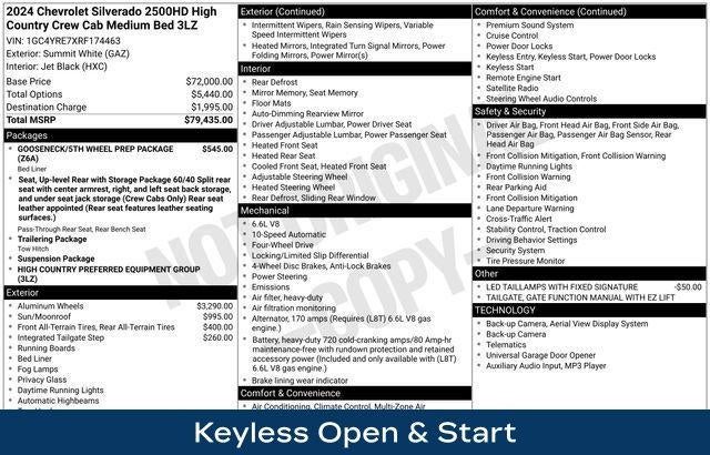 10-Way Power Driver Seat Adjuster w/Lumbar, 10-Way Power Passenger Seat Adjuster w/Lumbar, 120-Volt Bed Mounted Power Outlet, 120-Volt Interior Power Outlet, 170 Amp Alternator, 6 Rectangular Chromed Tubular Assist Steps, 720 Cold-Cranking Amps Heavy-Duty Battery, Apple CarPlay/Android Auto, Auto High-beam Headlights, Auto-Dimming Inside Rear-View Mirror, Bed View Camera w/2 Trailer Camera Provisions, Black Chevytec Spray-On Bedliner, Bluetooth® For Phone, BOSE Premium 7-Speaker Sound System, Chevrolet Connected Access Capable, Chrome Door Handles, Chrome Mirror Caps, Color-Keyed Carpeting Floor Covering, Compass, Deep-Tinted Glass, Electric Rear-Window Defogger, Electronic Cruise Control w/Set & Resume Speed, EZ Lift Power Lock & Release Tailgate, Front Carpeted Floor Mats, Front Chrome Recovery Hooks, Front LED Fog Lamps, Front Rain-Sensing Wipers, Gooseneck/5th Wheel Prep Package, Heated 2nd Row Outboard Seats, Heated Driver & Front Outboard Passenger Seating, Heated rear seats, Heated Steering Wheel, Hitch Guidance w/Hitch View, In-Vehicle Trailering App System, Keyless Open & Start, LED Cargo Area Lighting, LED Taillamps w/Fixed Signature, Manual Tilt & Telescoping Steering Column, Multi-Flex Tailgate, OnStar & Chevrolet Connected Services Capable, Polished Exhaust Tip, Power Door Locks, Power Front Windows w/Driver Express Up/Down, Power Front Windows w/Passenger Express Up/Down, Power Rear Windows w/Express Down, Power Sliding Rear Window w/Defogger, Power Sunroof, Preferred Equipment Group 3LZ, Push Button Start, Pwr Up/Down Tailgate Function w/Pwr Lock & Release, Radio: Chevrolet Infotainment 3 Premium System, Rain sensing wipers, Rear Carpeted Floor Mats, Rear Cross Traffic Alert, Rear Wheelhouse Liners, Remote Vehicle Starter System, SiriusXM w/360L, Standard Tailgate, Steering Wheel Audio Controls, Suspension Package, Trailer Camera Provisions, Ultrasonic Front & Rear Park Assist, Unauthorized Entry Theft-Deterrent System, Universal Home Remote, Up-Level Rear Seat w/Storage Package, Ventilated Driver & Front Passenger Seats, Wheels: 22 High Gloss Black Aluminum (LPO), Wi-Fi Hotspot Capable, Wireless Charging, Wireless Phone Projection, Wrapped Steering Wheel.