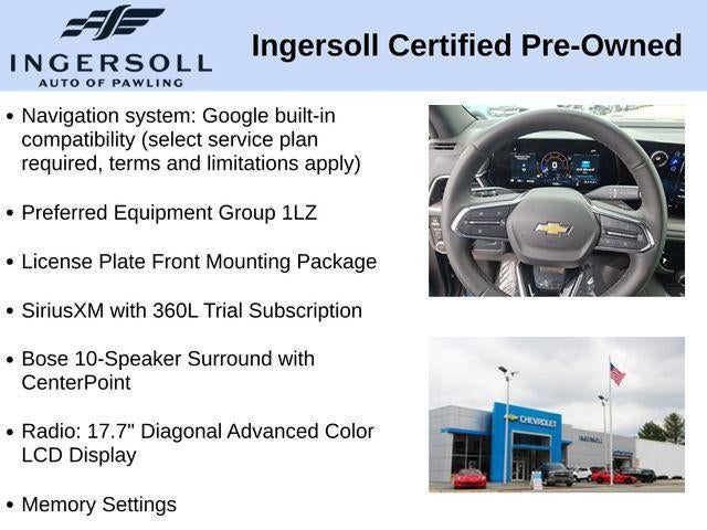 20 x 9 Polished Aluminum Wheels, 3rd Row 60/40 Power-Folding Split-Bench, 4-Way Power Driver Lumbar Seat Adjuster, 4-Way Power Front Passenger Lumbar Seat Adjuster, 8-Way Power Front Passenger Seat Adjuster, Apple CarPlay/Android Auto, Auto High-beam Headlights, Auto-Dimming Inside Rear-View Mirror, Bose 10-Speaker Surround with CenterPoint, Bright Front and Rear Door Sill Plates, Chrome Door Handles with Body-Color Strip, Chrome Mirror Caps, Dual Exhaust System, Exterior Parking Camera Rear, Front LED Fog Lamps, Fully automatic headlights, Heated 2nd Row Outboard Seats, Heated Driver and Front Passenger Seats, Heated Power-Adjustable Outside Mirrors, Heated Steering Wheel, LED Headlamps with LED Daytime Running Lamps, LED Tail Lamps, License Plate Front Mounting Package, Magnetic Ride Control Suspension, Memory Settings, Navigation system: Google built-in compatibility (select service plan required, terms and limitations apply), Perforated Heated and Ventilated Seats, Power Release 2nd Row Bucket Seats, Power Tilt and Telescopic Steering Column, Power-Sliding Center Floor Console, Preferred Equipment Group 1LZ, Radio: 17.7 Diagonal Advanced Color LCD Display, Rain sensing wipers, Rear Power Liftgate, Remote keyless entry, SiriusXM with 360L Trial Subscription, Universal Home Remote, Wireless Apple CarPlay/Wireless Android Auto, Wireless Phone Charging.