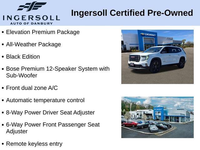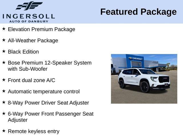 The Acadia Elevation's striking exterior design, highlighted by the Black Edition's bold accents and 22-inch Gloss Black aluminum wheels, commands attention on the road. The available All-Weather Package, with its all-season floor mats and liners, ensures you're prepared for any conditions, while the Elevation Premium Package adds even more premium touches to elevate your driving experience.