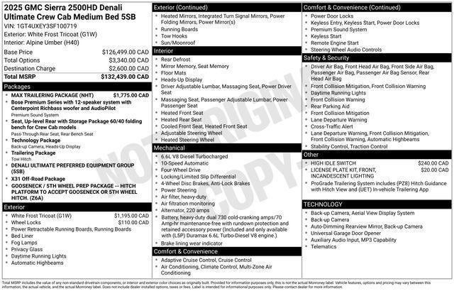 The Sierra 2500HD Denali Ultimate is meticulously crafted with premium materials and state-of-the-art technology throughout. The stunning white exterior, complemented by the Vader chrome Denali grille, exudes a bold, commanding presence. Step inside and you'll be surrounded by genuine wood accents, supple full-grain leather seating, and a 15-inch Head-Up Display that puts critical information right in your line of sight.