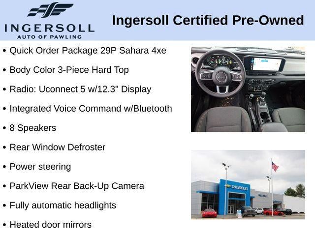 4G LTE Wi-Fi Hot Spot, 8 Speakers, Apple CarPlay/Android Auto, Body Color 3-Piece Hard Top, Freedom Panel Storage Bag, Front Bucket Seats, Fully automatic headlights, Heated door mirrors, Heated front seats, Heated steering wheel, Integrated Voice Command w/Bluetooth®, ParkView Rear Back-Up Camera, Power steering, Quick Order Package 29P Sahara 4xe, Radio: Uconnect 5 w/12.3 Display, Rear Window Defroster, Rear Window Wiper/Washer, Wheels: 20 x 8 Painted Black Aluminum.